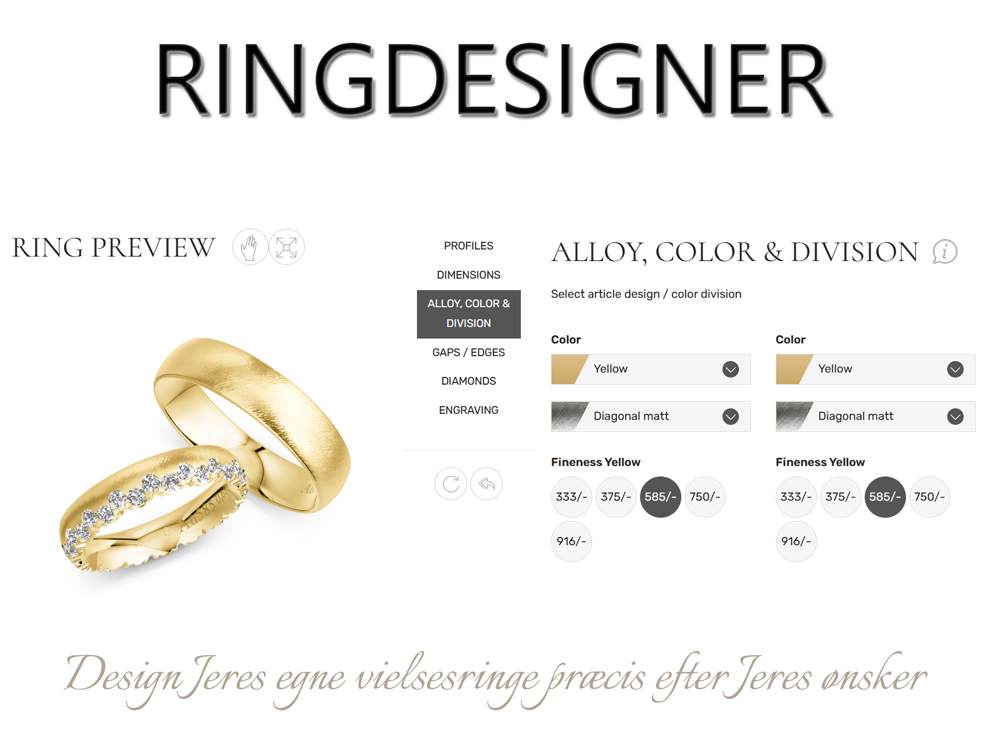 I ringdesigneren har I mulighed for at vælge alt fra profil, tykkelse og bredde på ringene, overflade, stensætning samt meget mere. Mulighederne er uendelige og kun I bestemmer, hvordan det færdige resultat ser ud.
